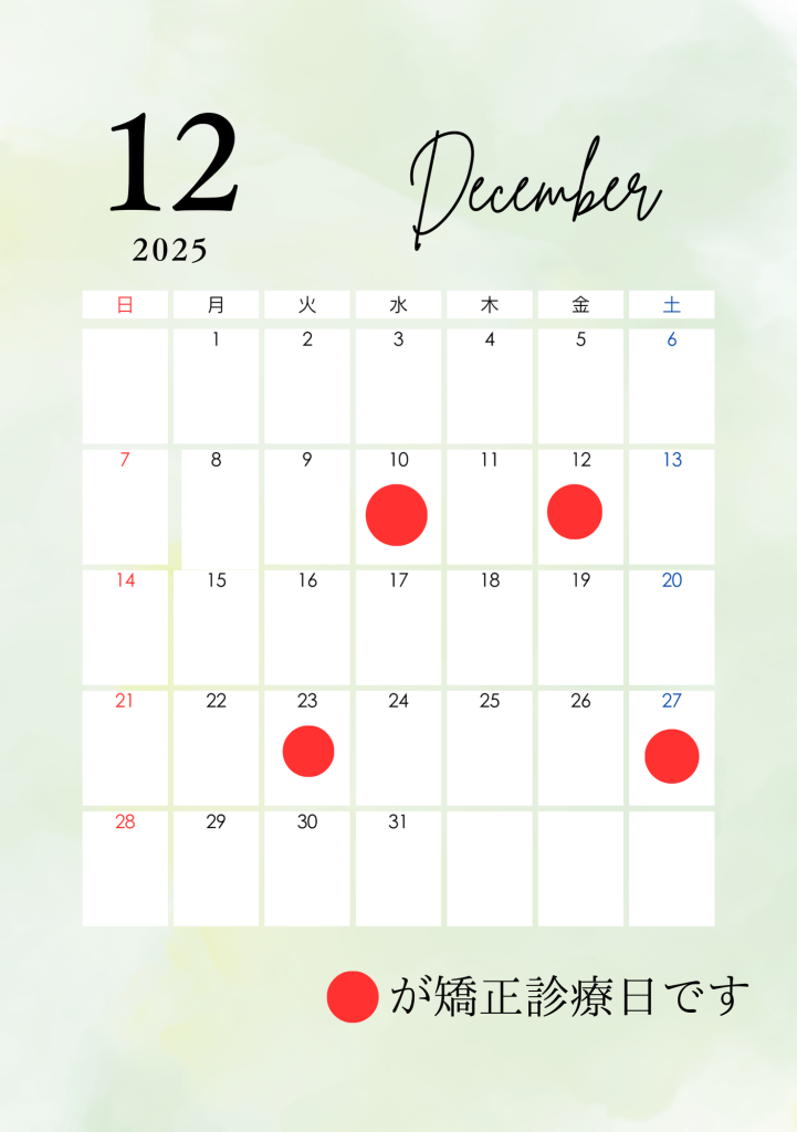 12月、1月は矯正医がセミナー参加のため木曜日の診療はありません。